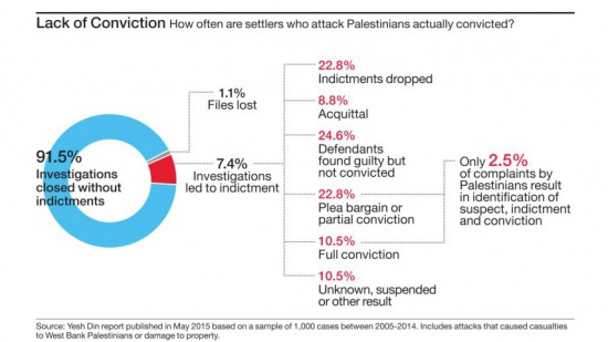 Izraelský deník Haaretz po teroristickém útoku na palestinskou rodinu Dawabša na konci července, při kterém zaživa uhořelo 18měsíční dítě a rodiče později zemřeli v nemocnici, vizualizoval statistiku židovských teroristických útoků a beztrestnosti, které se v Izraeli těší. V naprosté většině, 91, 5 % nahlášených případů mezi lety 2005 - 2014, pachatelé nebyli ani obviněni a vyšetřování bylo uzavřeno, vyplývá z dat izraelské lidskoprávní organizace Yesh Din. Ze 7,5 % těch, kteří byli obviněni, bylo odsouzeno pouze 2,5 %. Haaretz: Israel’s Dismal Record of Arresting and Convicting Jewish Terrorists